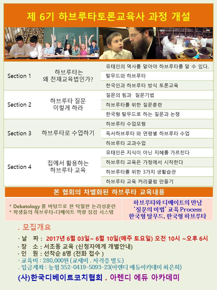 질문과 토론으로 생각너머 생각을 할 수 있고 나만의 생각을 만들어 내며, 뇌를 깨워 공부머리가 열리게 도와주는 촉진자, 하브루타-디베이트 코치가 되시기 바랍니다.