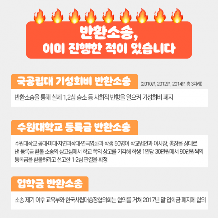 수원대 등록금 반환 소송의 경우 지난 2013년 학교측이 실험·실습비 명목으로 받은 금액을 제대로 사용하지 않았다는 이유로 50명의 학생들이 반환을 요청한 것.